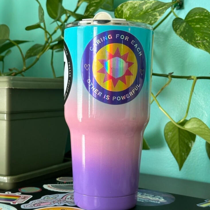 ID: a photo of the holographic sticker on a colorful water bottle with a teal pink purple gradient, resting in front of a plant. The design is a circular sticker with a purple border and golden yellow background. In the center is a white N95 bifold respirator with a burst of soft pink behind it. Cartoon style white text in a curve on the top and bottom border reads: Caring for each other is powerful. there is a yellow heart outline between each set of curved text on the sides. End ID.