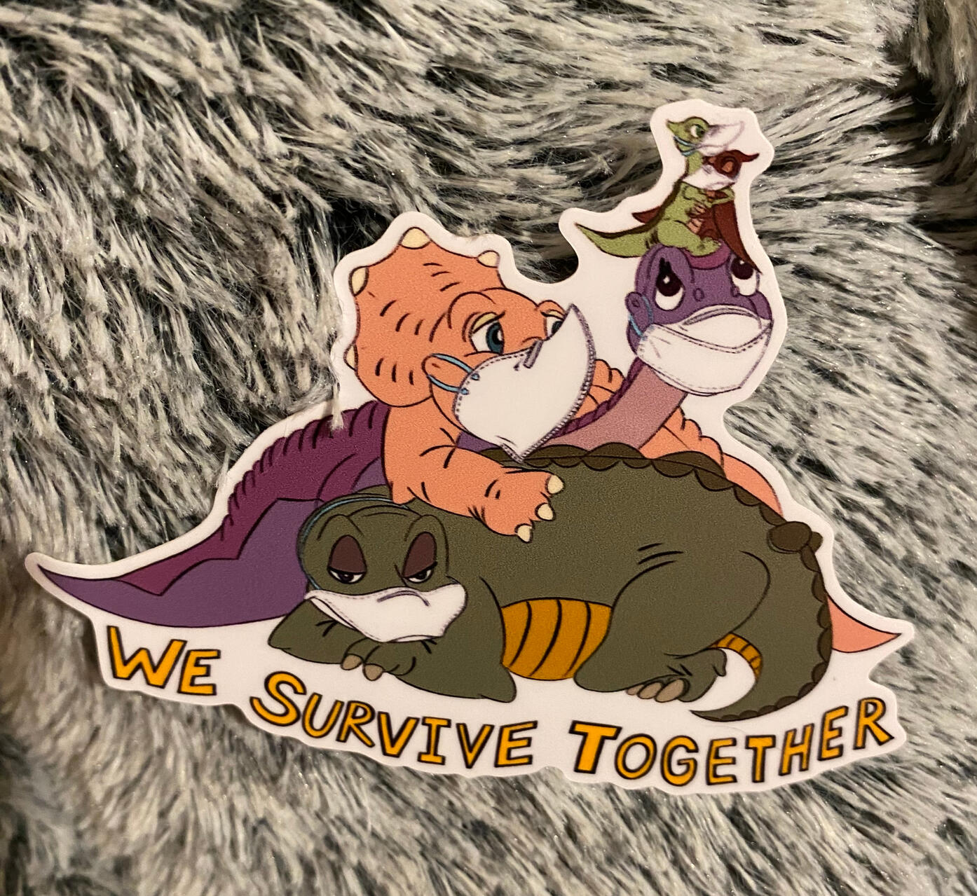 ID: Close up of a sticker against a grey fuzzy fabric. The sticker is a contour of a drawing of the dinosaurs from the animated movie, the Land Before Time. They are huddled together, from bottom to top is: Spike, Littlefoot, Cera, and then Ducky and Petrie are hugging while perched on Littlefoot’s head. Spike, Ducky and Petrie are wearing white duckbill N95’s. Cera is wearing a bifold kn95 and Littlefoot is wearing a boat shaped kf94. Underneath the group is dandelion colored text in a black outline: we survive together. End ID.