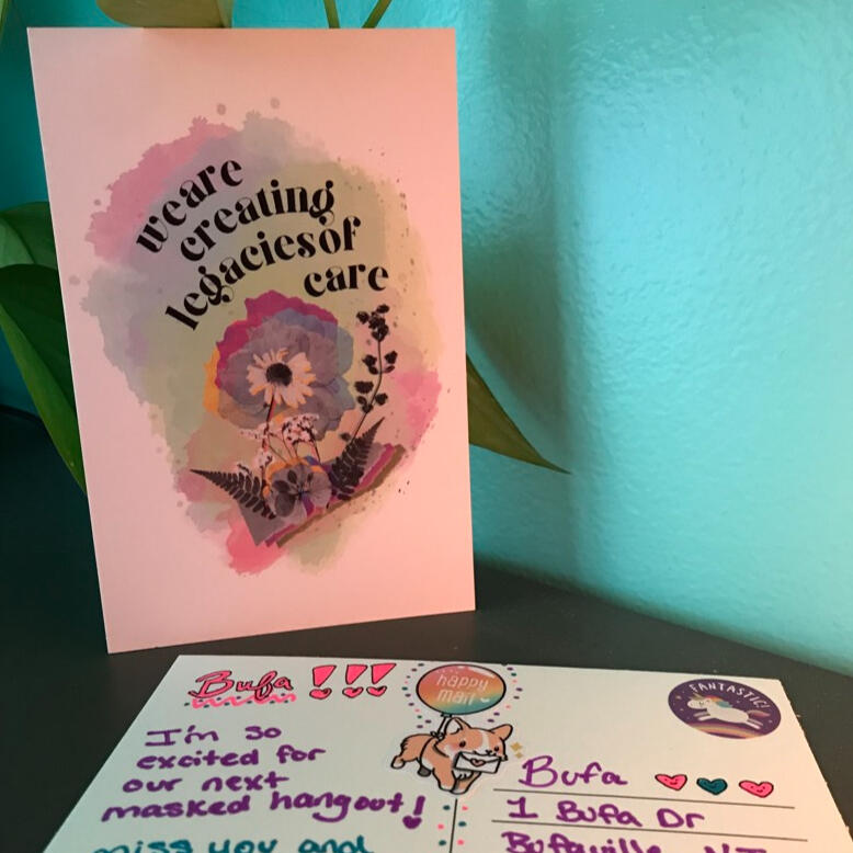 ID: A photo of a postcard, horizontal placement, on a desk with handwriting facing up, and another postcard, vertical placement, with the print side facing the camera, propped up against a ivy plant. The design on the postcard/print is a white background with black bold text slightly angled and flowing in multiple lines: we are creating legacies of care. Underneath the text are noir style greyscale pressed flowers and leaves with various shadows in bright colors of purple, blue, green and yellow. The entire design is centered on the print, and has a paint brushed effect cloud of soft pinks, greens, and purples behind it. End ID.