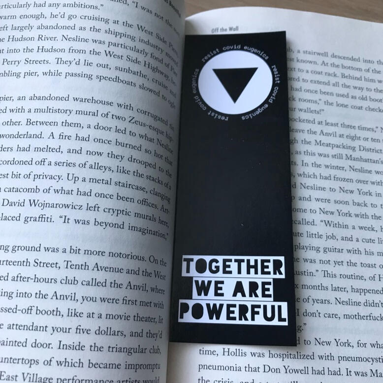 ID: A close up photo of an open book, “It was Vulgar and it was Beautiful: How AIDS Activists Used Art to Fight a Pandemic.” In between the pages is a black bookmark with a white circle at the top. In the center of the circle is an upside-down black triangle. Typewriter style white text goes around the circle three times: resist covid eugenics. At the bottom of the bookmark is bold black text with white rectangles behind each line: Together we are powerful. End ID.