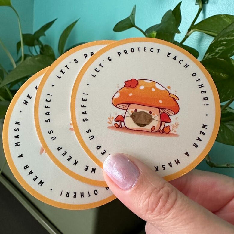 ID: photo of artist’s hand holding up three of the stickers between their fingers, with a plant in the background. It is a circular sticker with a golden yellow border and light tan background. In the center is an orange spotted cap mushroom wearing a forest green duckbill respirator. Comic Sans style dark brown text goes around the border: Let’s protect each other! + Wear a Mask + We Keep us Safe! + End ID.
