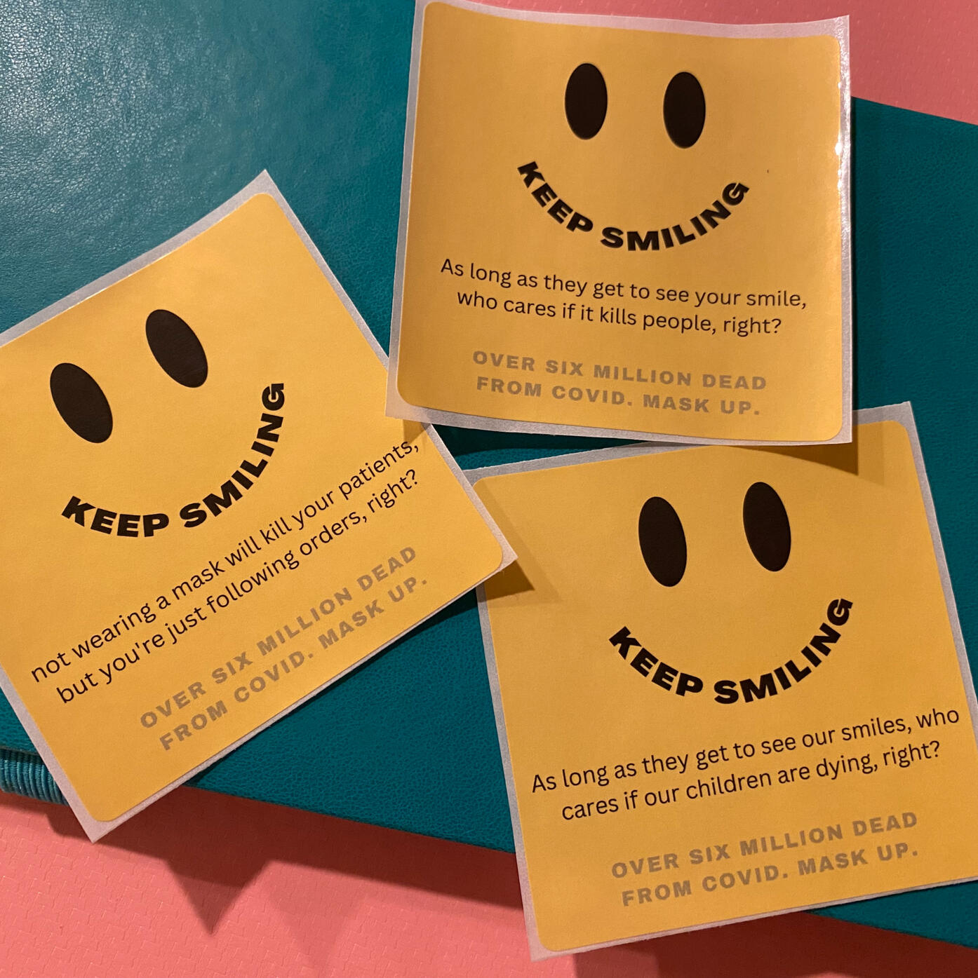 Vinyl glossy yellow 3 inch stickers featuring all 3 of my original Anti-Eugenics stickers designs.Let’s disrupt the Covid eugenics wherever you go! Perfect for slapping onto telephone poles, subway seats, campus bus stops, bathroom stalls, etc.1st design text: Keep smiling. As long as they get to see your smiles, who cares if it kills people, right? Over six million dead from covid. Mask up.2nd design text: Keep smiling. As long as they get to see our smiles, who cares if our children are dying, right? Over six million dead from covid. Mask up.3rd design text: Keep smiling. Not wearing a mask will kill your patients, but you’re just following orders, right? Over six million dead from covid. Mask up.