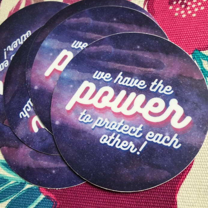 ID: a photo of several stickers layered on top of each other against fabric decorated with pink flowers and teal leaves. It’s a circular sticker with a galaxy background in soft pinks, various purples and deep blues. In the center is cursive bold text with dark purple and pink shadows: we have the power to protect each other. The text is slightly on an angle, and the word power is bigger than the rest of the words. End ID.
