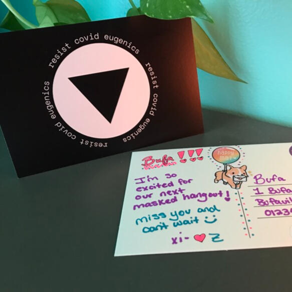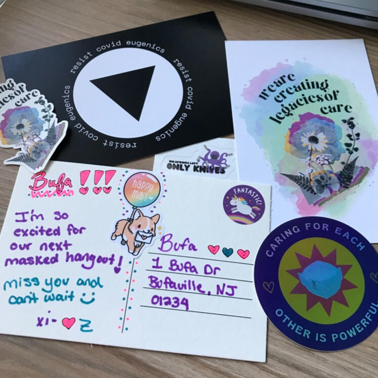 ID: A close up photo of the postcard print set, along with other stickers from my shop. Near the bottom left is the handwriting side of a postcard, cutely decorated by stickers and markers, with the following message: Bufa!!! I’m so excited for our next masked hangout! Miss you and can’t wait (smiley face). xi-heart Z. There is a fake address included. To each side of and above the card is a sticker, and the two available prints are next to each other above it. sticker id: a 3-inch circular holographic sticker with a purple border and golden yellow background. In the center is a white N95 bifold respirator with a burst of soft pink behind it. Cartoon style white text in a curve on the top and bottom border reads: Caring for each other is powerful. there is a yellow heart outline between each set of curved text on the sides. The design on the postcard/print is a black background with a white circle in the center. In the center of the circle itself is an upside-down black triangle. Typewriter style white text goes around the circle three times: resist covid eugenics. End ID.