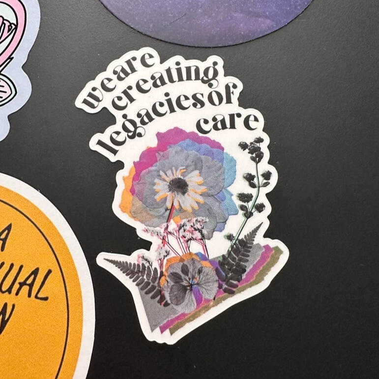 ID: a photo of the sticker against a black laptop, with a few other stickers mostly out of frame. The sticker is a design of black bold text slightly angled and flowing in multiple lines: we are creating legacies of care. Underneath the text are noir style greyscale pressed flowers and leaves with various shadows in bright colors of purple, blue, green and yellow. End ID.