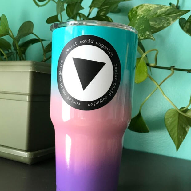 ID: photo of the sticker on a water bottle with a teal pink purple gradient, a plant in the background. It’s a circular sticker with a black border and white background. In the center of the sticker is an upside-down black triangle. Typewriter style white text goes around the border three times: resist covid eugenics. End ID.